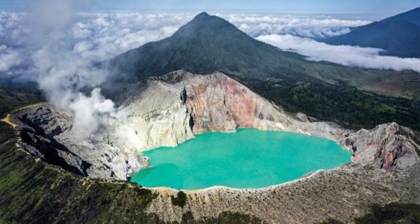 夜明けとともに、煙の立ち上る火口壁の間に輝く、東南アジア最大のターコイズブルーの酸性湖を見つめましょう。
