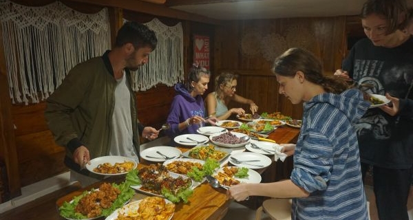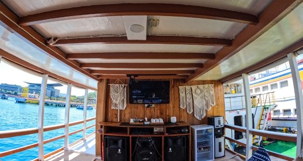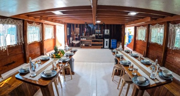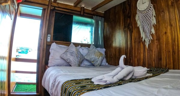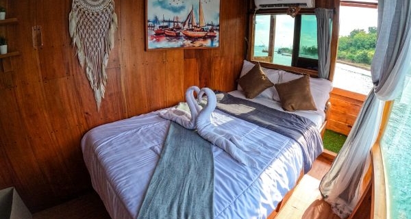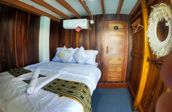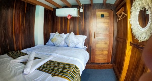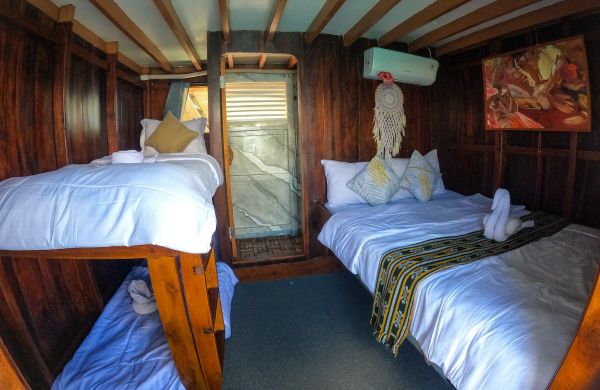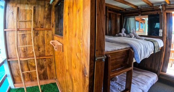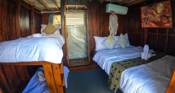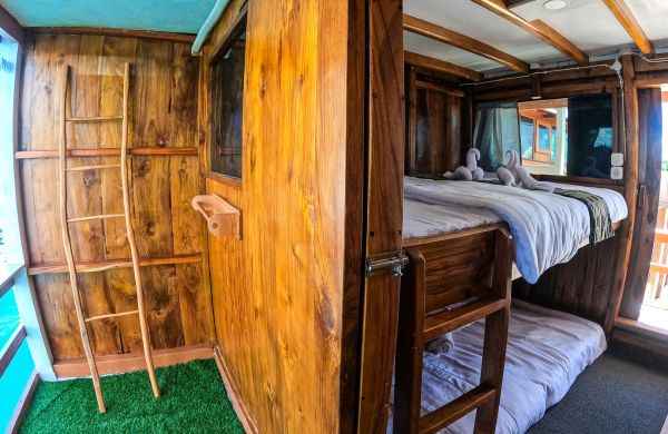 공유 캐빈 1 | 공유 객실 1 – (메인 데크) 더블 침대 1개와 싱글 이층 침대 2개(4인용) 에어컨 창문 전망 샤워실과 화장실이 딸린 욕실 수건, 비누, 샴푸 메인 데크에 위치 가격 IDR 3,350,000 / 1인 최소 예약 인원 1명 *3인 이용 가능, 가격: IDR 4,000,000 /인 |